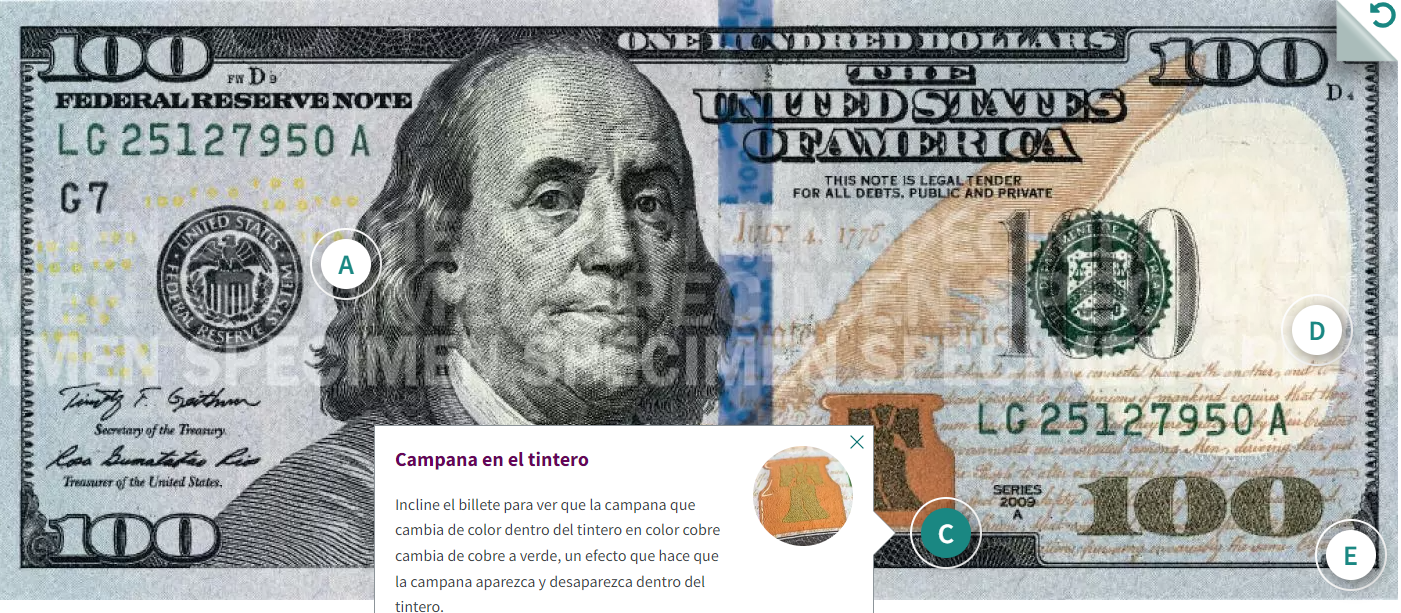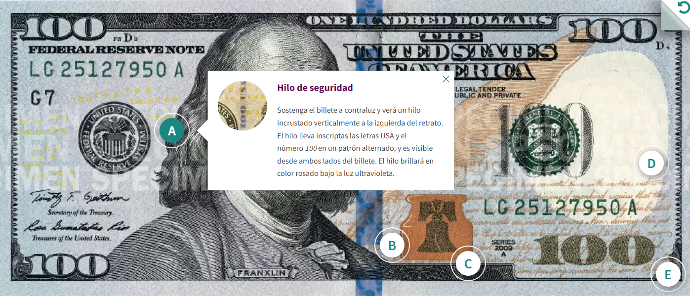 como-saber-si-un-billete-de-dolar-es-falsoHaz click en los 100 dólares para ver la medida de seguridad
